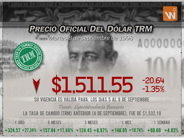 La tasa de cambio representativa del mercado (TRM) se fijó en $1,511.55 para el día martes 8 de septiembre de 1998, lo que representa una disminución de $-20.64 (una variación del -1.35%) frente a la TRM anterior de $1,532.19. Esto representa una diferencia de -20.64 pesos.