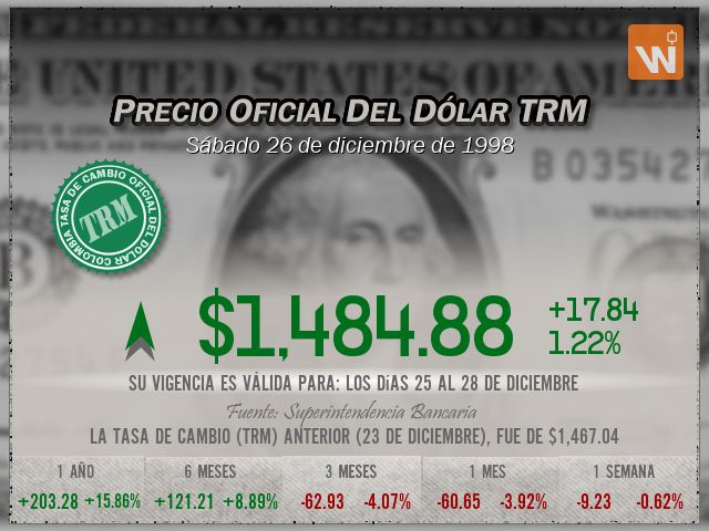Esta es la TRM del sábado 26 de diciembre de 1998, y su vigencia cubre los días 25 al 28 de diciembre. Un (1) dólar estadounidense equivale a 'mil cuatrocientos ochenta y cuatro pesos con ochenta y ocho centavos colombianos'.
