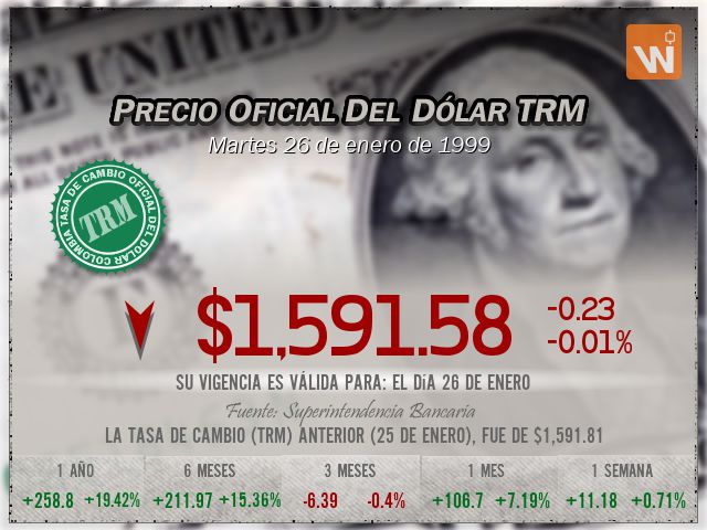 La tasa de cambio representativa del mercado (TRM) se fijó en $1,591.58 para el día martes 26 de enero de 1999, lo que representa una disminución de $-0.23 (una variación del -0.01%) frente a la TRM anterior de $1,591.81. Una pequeñísima diferencia de tan solo -0.23 pesos.