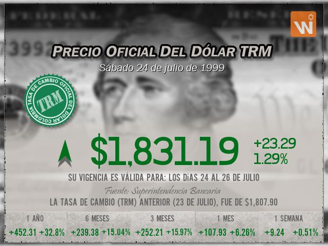 Esta es la TRM del sábado 24 de julio de 1999, y su vigencia cubre los días 24 al 26 de julio. Un (1) dólar estadounidense equivale a 'mil ochocientos treinta y un pesos con diecinueve centavos colombianos'.
