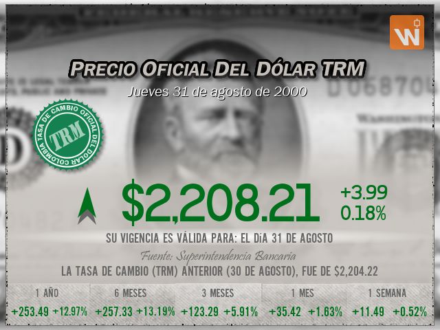 La tasa de cambio representativa del mercado (TRM) se fijó en $2,208.21 para el día jueves 31 de agosto de 2000, lo que representa un aumento de $3.99 (una variación del 0.18%) frente a la TRM anterior de $2,204.22. Una pequeñísima diferencia de tan solo 3.99 pesos.