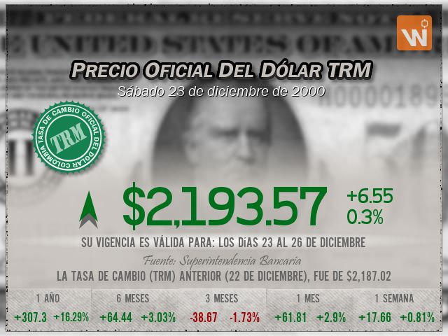 La tasa de cambio representativa del mercado (TRM) se fijó en $2,193.57 para el día sábado 23 de diciembre de 2000, lo que representa un aumento de $6.55 (una variación del 0.30%) frente a la TRM anterior de $2,187.02. Una muy corta diferencia de tan solo 6.55 pesos.