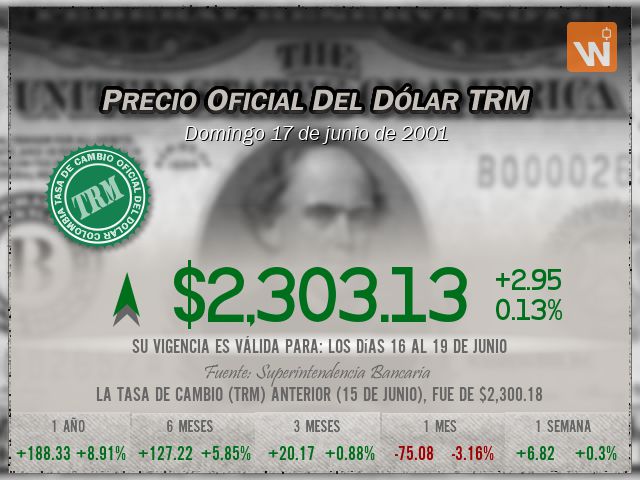 La tasa de cambio representativa del mercado (TRM) se fijó en $2,303.13 para el día domingo 17 de junio de 2001, lo que representa un aumento de $2.95 (una variación del 0.13%) frente a la TRM anterior de $2,300.18. Una pequeñísima diferencia de tan solo 2.95 pesos.