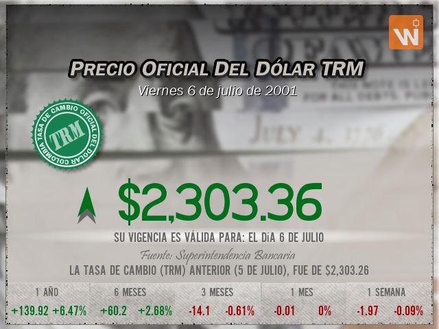 La tasa de cambio representativa del mercado (TRM) se fijó en $2,303.36 para el día viernes 6 de julio de 2001, lo que representa un aumento de $0.10 (una variación del ) frente a la TRM anterior de $2,303.26. Una pequeñísima diferencia de tan solo 0.10 pesos.