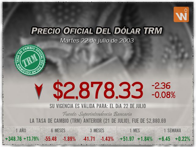 Esta es la TRM del martes 22 de julio de 2003. Un (1) dólar estadounidense equivale a 'dos mil ochocientos setenta y ocho pesos con treinta y tres centavos colombianos'.