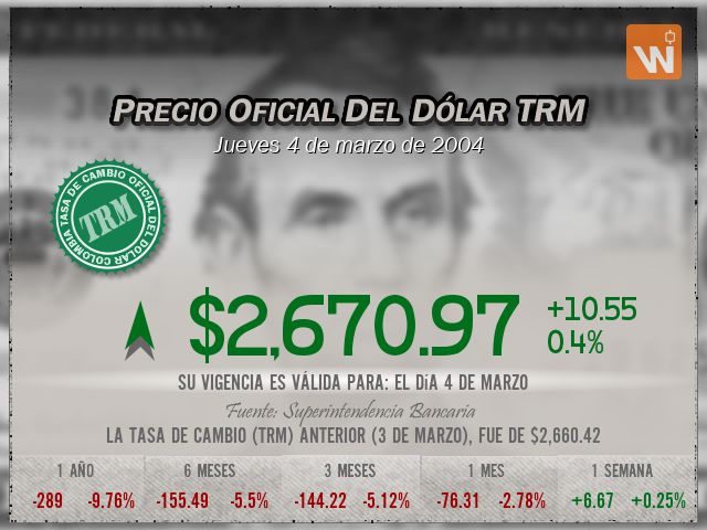 La tasa TRM a la que se liquida el precio del dólar es de $2,670.97, con vigencia para el jueves 4 de marzo de 2004.