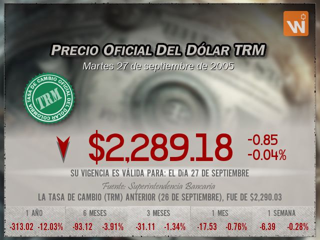 Esta es la TRM del martes 27 de septiembre de 2005. Un (1) dólar estadounidense equivale a 'dos mil doscientos ochenta y nueve pesos con dieciocho centavos colombianos'.