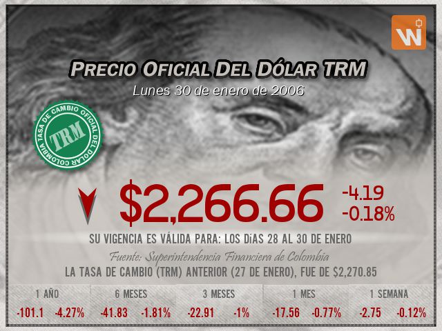 Esta es la TRM del lunes 30 de enero de 2006, y su vigencia cubre los días 28 al 30 de enero. Un (1) dólar estadounidense equivale a 'dos mil doscientos sesenta y seis pesos con sesenta y seis centavos colombianos'.