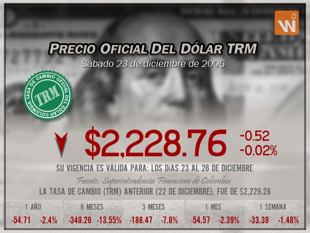Esta es la TRM del sábado 23 de diciembre de 2006, y su vigencia cubre los días 23 al 26 de diciembre. Un (1) dólar estadounidense equivale a 'dos mil doscientos veintiocho pesos con setenta y seis centavos colombianos'.