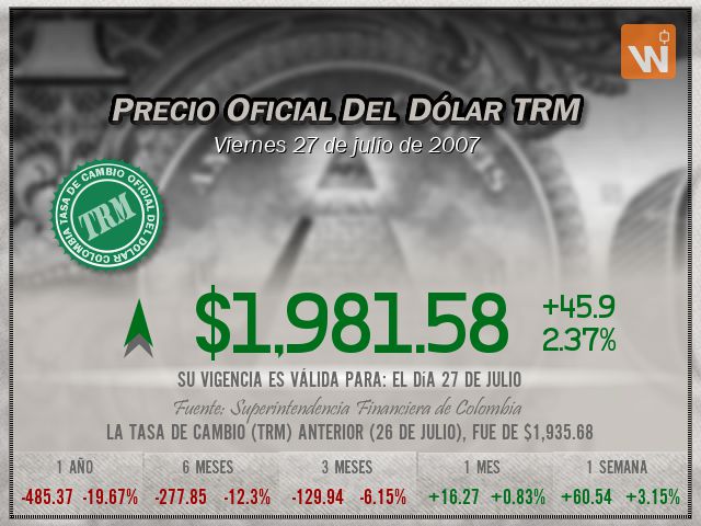 Esta es la TRM del viernes 27 de julio de 2007. Un (1) dólar estadounidense equivale a 'mil novecientos ochenta y un pesos con cincuenta y ocho centavos colombianos'.