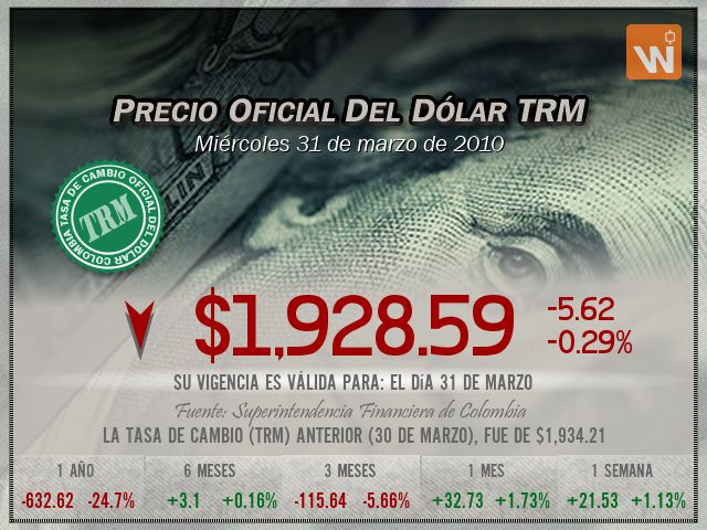 Esta es la TRM del miércoles 31 de marzo de 2010. Un (1) dólar estadounidense equivale a 'mil novecientos veintiocho pesos con cincuenta y nueve centavos colombianos'.
