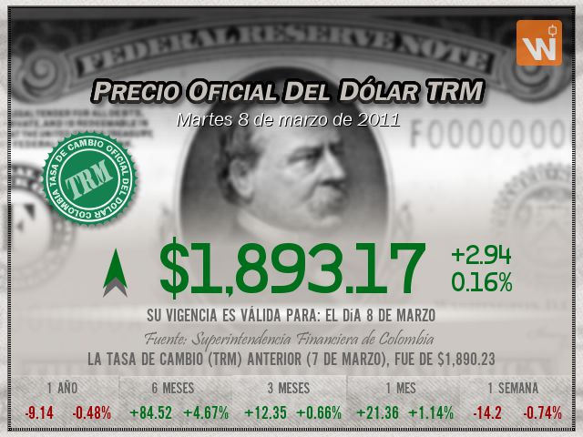Esta es la TRM del martes 8 de marzo de 2011. Un (1) dólar estadounidense equivale a 'mil ochocientos noventa y tres pesos con diecisiete centavos colombianos'.