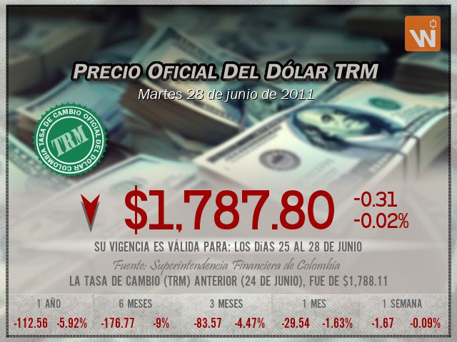 Esta es la TRM del martes 28 de junio de 2011, y su vigencia cubre los días 25 al 28 de junio. Un (1) dólar estadounidense equivale a 'mil setecientos ochenta y siete pesos con ocho centavos colombianos'.