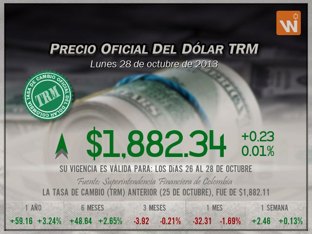 Esta es la TRM del lunes 28 de octubre de 2013, y su vigencia cubre los días 26 al 28 de octubre. Un (1) dólar estadounidense equivale a 'mil ochocientos ochenta y dos pesos con treinta y cuatro centavos colombianos'.