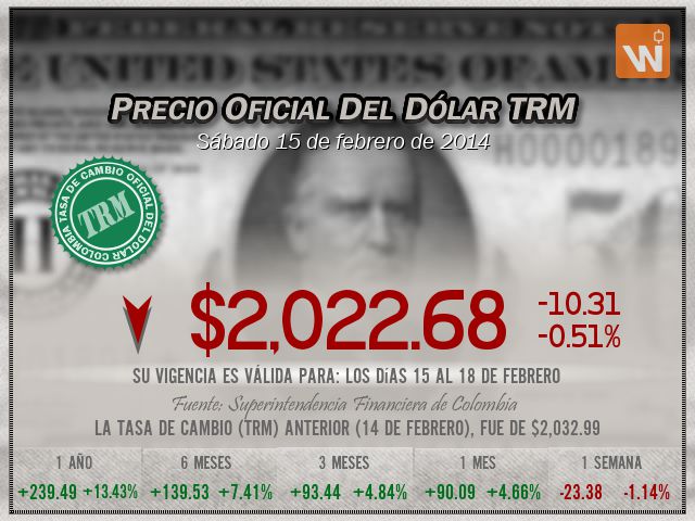 Esta es la TRM del sábado 15 de febrero de 2014, y su vigencia cubre los días 15 al 18 de febrero. Un (1) dólar estadounidense equivale a 'dos mil veintidós pesos con sesenta y ocho centavos colombianos'.