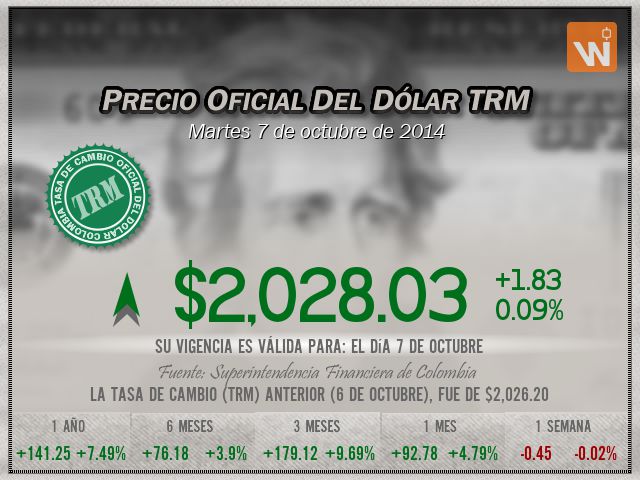 La tasa TRM a la que se liquida el precio del dólar es de $2,028.03, con vigencia para el martes 7 de octubre de 2014.