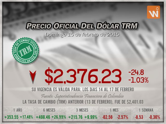 Esta es la TRM del domingo 15 de febrero de 2015, y su vigencia cubre los días 14 al 17 de febrero. Un (1) dólar estadounidense equivale a 'dos mil trescientos setenta y seis pesos con veintitrés centavos colombianos'.
