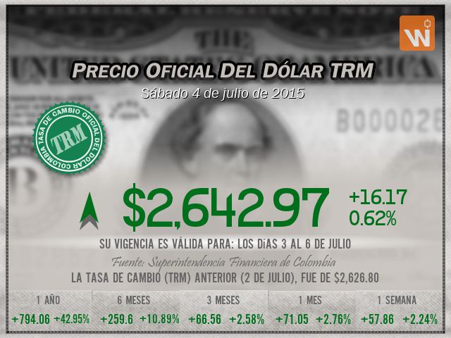 Esta es la TRM del sábado 4 de julio de 2015, y su vigencia cubre los días 3 al 6 de julio. Un (1) dólar estadounidense equivale a 'dos mil seiscientos cuarenta y dos pesos con noventa y siete centavos colombianos'.
