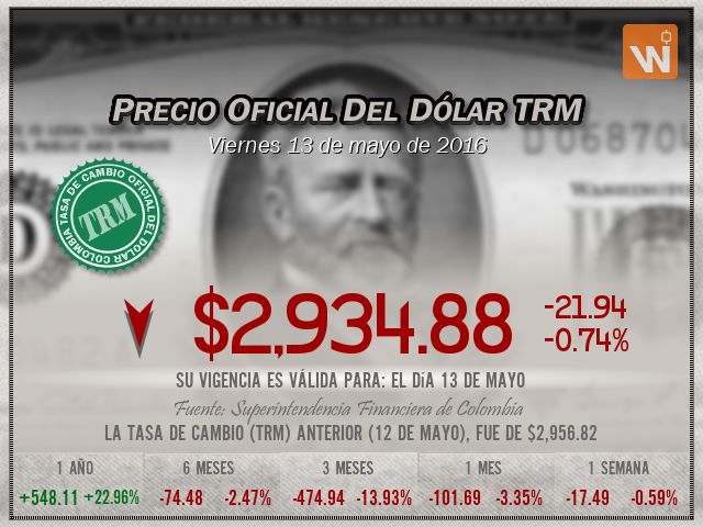 Esta es la TRM del viernes 13 de mayo de 2016. Un (1) dólar estadounidense equivale a 'dos mil novecientos treinta y cuatro pesos con ochenta y ocho centavos colombianos'.