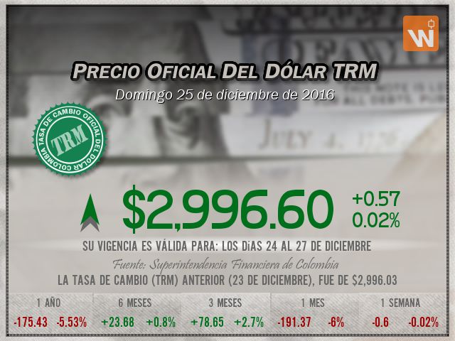 Esta es la TRM del domingo 25 de diciembre de 2016, y su vigencia cubre los días 24 al 27 de diciembre. Un (1) dólar estadounidense equivale a 'dos mil novecientos noventa y seis pesos con seis centavos colombianos'.
