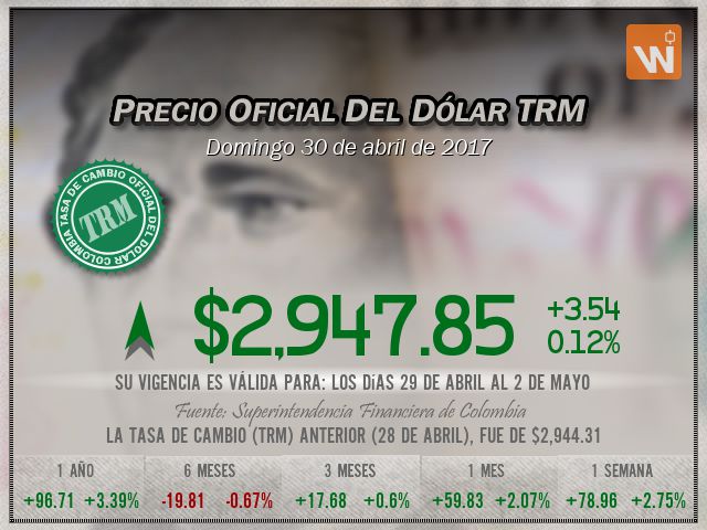 Esta es la TRM del domingo 30 de abril de 2017, y su vigencia cubre los días 29 de abril al 2 de mayo. Un (1) dólar estadounidense equivale a 'dos mil novecientos cuarenta y siete pesos con ochenta y cinco centavos colombianos'.