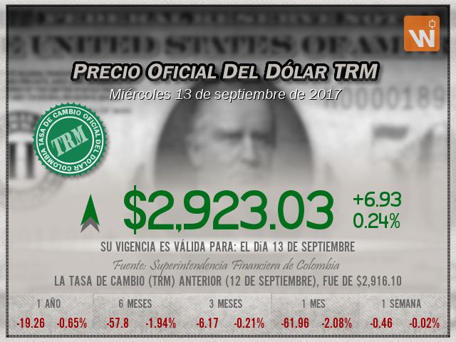 Esta es la TRM del miércoles 13 de septiembre de 2017. Un (1) dólar estadounidense equivale a 'dos mil novecientos veintitrés pesos con tres centavos colombianos'.