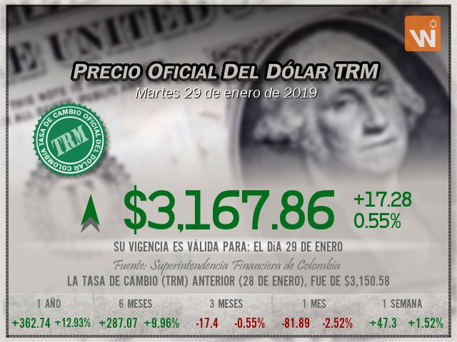 Esta es la TRM del martes 29 de enero de 2019. Un (1) dólar estadounidense equivale a 'tres mil ciento sesenta y siete pesos con ochenta y seis centavos colombianos'.