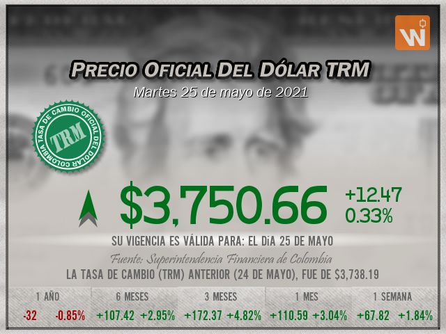 La tasa TRM a la que se liquida el precio del dólar es de $3,750.66, con vigencia para el martes 25 de mayo de 2021.