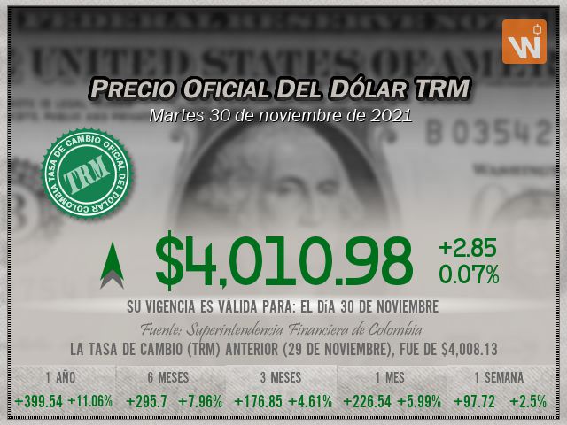 La tasa TRM a la que se liquida el precio del dólar es de $4,010.98, con vigencia para el martes 30 de noviembre de 2021.