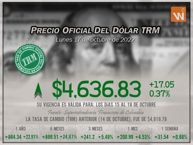 Esta es la TRM del lunes 17 de octubre de 2022, y su vigencia cubre los días 15 al 18 de octubre. Un (1) dólar estadounidense equivale a 'cuatro mil seiscientos treinta y seis pesos con ochenta y tres centavos colombianos'.