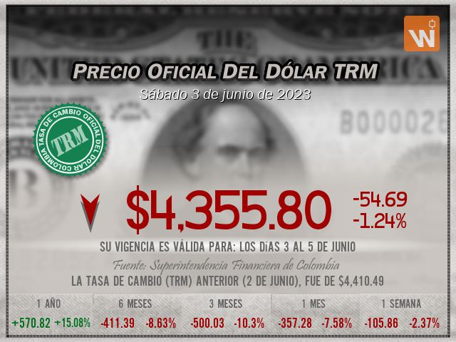 Esta es la TRM del sábado 3 de junio de 2023, y su vigencia cubre los días 3 al 5 de junio. Un (1) dólar estadounidense equivale a 'cuatro mil trescientos cincuenta y cinco pesos con ocho centavos colombianos'.