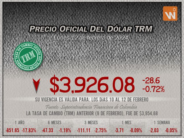 Esta es la TRM del lunes 12 de febrero de 2024, y su vigencia cubre los días 10 al 12 de febrero. Un (1) dólar estadounidense equivale a 'tres mil novecientos veintiséis pesos con ocho centavos colombianos'.