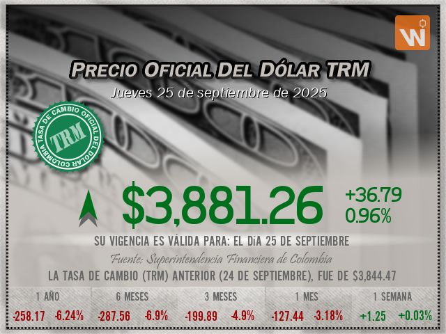 Esta es la TRM del jueves 25 de septiembre de 2025. Un (1) dólar estadounidense equivale a 'tres mil ochocientos ochenta y un pesos con veintiséis centavos colombianos'.