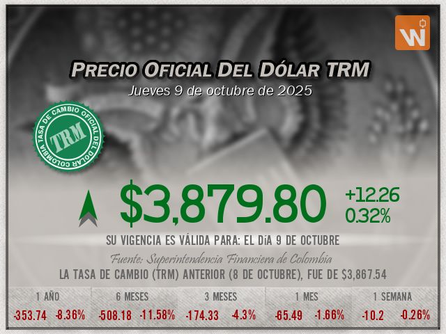Esta es la TRM del jueves 9 de octubre de 2025. Un (1) dólar estadounidense equivale a 'tres mil ochocientos setenta y nueve pesos con ocho centavos colombianos'.