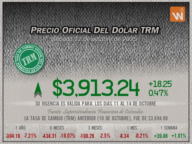 Esta es la TRM del sábado 11 de octubre de 2025, y su vigencia cubre los días 11 al 14 de octubre. Un (1) dólar estadounidense equivale a 'tres mil novecientos trece pesos con veinticuatro centavos colombianos'.