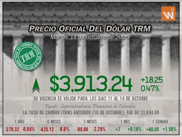 Esta es la TRM del martes 14 de octubre de 2025, y su vigencia cubre los días 11 al 14 de octubre. Un (1) dólar estadounidense equivale a 'tres mil novecientos trece pesos con veinticuatro centavos colombianos'.