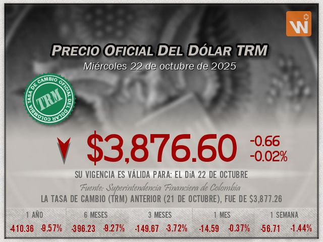 Esta es la TRM del miércoles 22 de octubre de 2025. Un (1) dólar estadounidense equivale a 'tres mil ochocientos setenta y seis pesos con seis centavos colombianos'.
