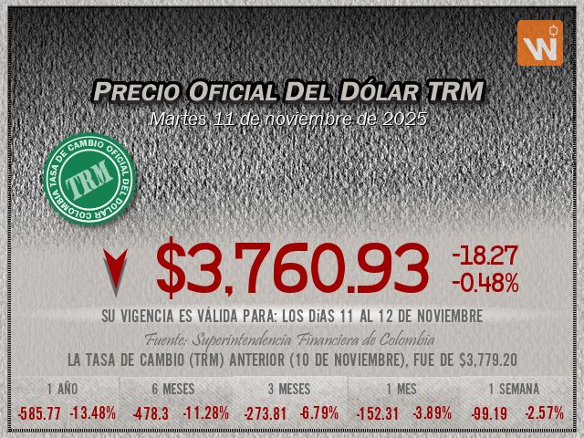 Esta es la TRM del martes 11 de noviembre de 2025, y su vigencia cubre los días 11 al 12 de noviembre. Un (1) dólar estadounidense equivale a 'tres mil setecientos sesenta pesos con noventa y tres centavos colombianos'.