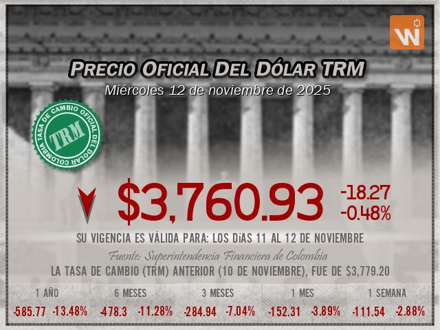 Esta es la TRM del miércoles 12 de noviembre de 2025, y su vigencia cubre los días 11 al 12 de noviembre. Un (1) dólar estadounidense equivale a 'tres mil setecientos sesenta pesos con noventa y tres centavos colombianos'.