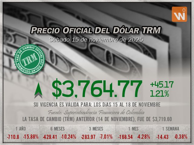 Esta es la TRM del sábado 15 de noviembre de 2025, y su vigencia cubre los días 15 al 18 de noviembre. Un (1) dólar estadounidense equivale a 'tres mil setecientos sesenta y cuatro pesos con setenta y siete centavos colombianos'.