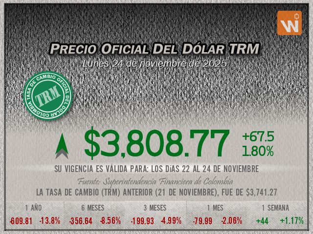 Esta es la TRM del lunes 24 de noviembre de 2025, y su vigencia cubre los días 22 al 24 de noviembre. Un (1) dólar estadounidense equivale a 'tres mil ochocientos ocho pesos con setenta y siete centavos colombianos'.