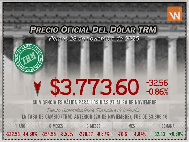 Esta es la TRM del viernes 28 de noviembre de 2025, y su vigencia cubre los días 27 al 28 de noviembre. Un (1) dólar estadounidense equivale a 'tres mil setecientos setenta y tres pesos con seis centavos colombianos'.