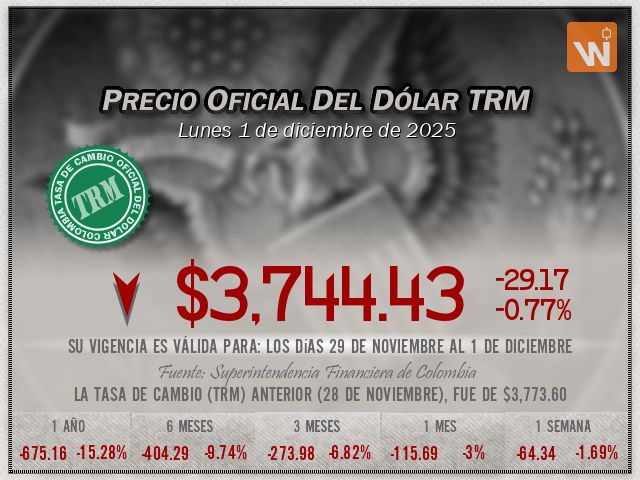 Esta es la TRM del lunes 1 de diciembre de 2025, y su vigencia cubre los días 29 de noviembre al 1 de diciembre. Un (1) dólar estadounidense equivale a 'tres mil setecientos cuarenta y cuatro pesos con cuarenta y tres centavos colombianos'.