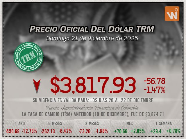 Esta es la TRM del domingo 21 de diciembre de 2025, y su vigencia cubre los días 20 al 22 de diciembre. Un (1) dólar estadounidense equivale a 'tres mil ochocientos diecisiete pesos con noventa y tres centavos colombianos'.