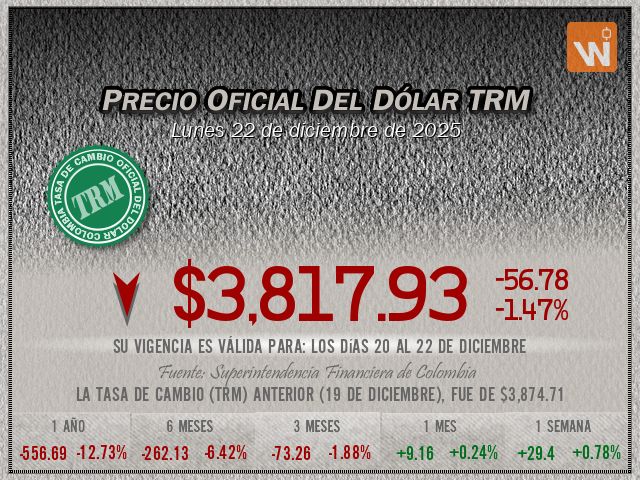 Esta es la TRM del lunes 22 de diciembre de 2025, y su vigencia cubre los días 20 al 22 de diciembre. Un (1) dólar estadounidense equivale a 'tres mil ochocientos diecisiete pesos con noventa y tres centavos colombianos'.