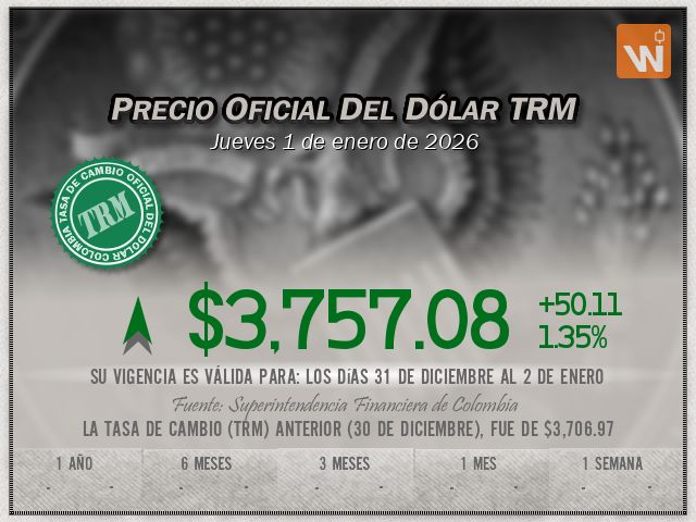 Esta es la TRM del jueves 1 de enero de 2026, y su vigencia cubre los días 31 de diciembre al 2 de enero. Un (1) dólar estadounidense equivale a 'tres mil setecientos cincuenta y siete pesos con ocho centavos colombianos'.