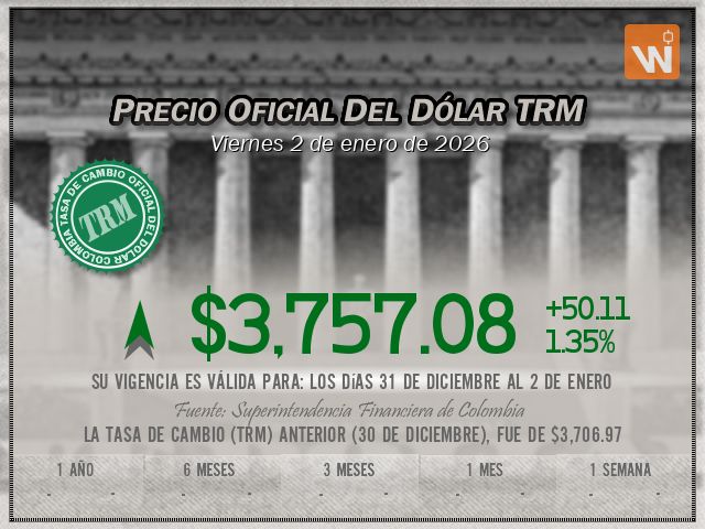 Esta es la TRM del viernes 2 de enero de 2026, y su vigencia cubre los días 31 de diciembre al 2 de enero. Un (1) dólar estadounidense equivale a 'tres mil setecientos cincuenta y siete pesos con ocho centavos colombianos'.