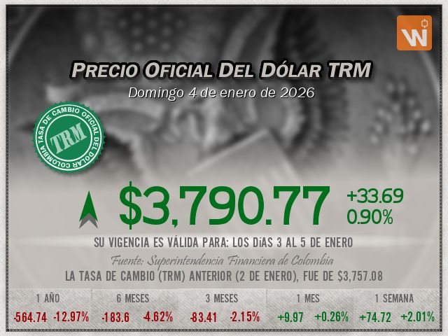 Esta es la TRM del domingo 4 de enero de 2026, y su vigencia cubre los días 3 al 5 de enero. Un (1) dólar estadounidense equivale a 'tres mil setecientos noventa pesos con setenta y siete centavos colombianos'.