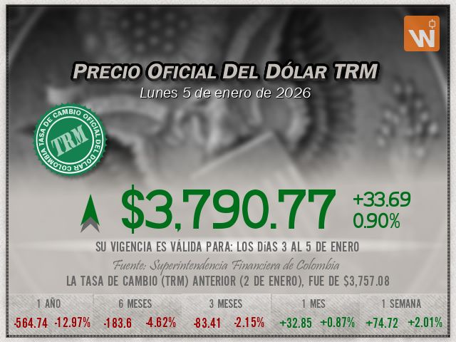 Esta es la TRM del lunes 5 de enero de 2026, y su vigencia cubre los días 3 al 5 de enero. Un (1) dólar estadounidense equivale a 'tres mil setecientos noventa pesos con setenta y siete centavos colombianos'.