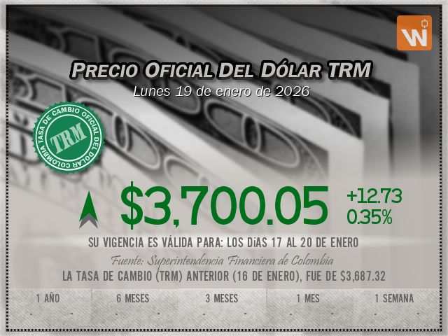 Esta es la TRM del lunes 19 de enero de 2026, y su vigencia cubre los días 17 al 20 de enero. Un (1) dólar estadounidense equivale a 'tres mil setecientos pesos con cinco centavos colombianos'.